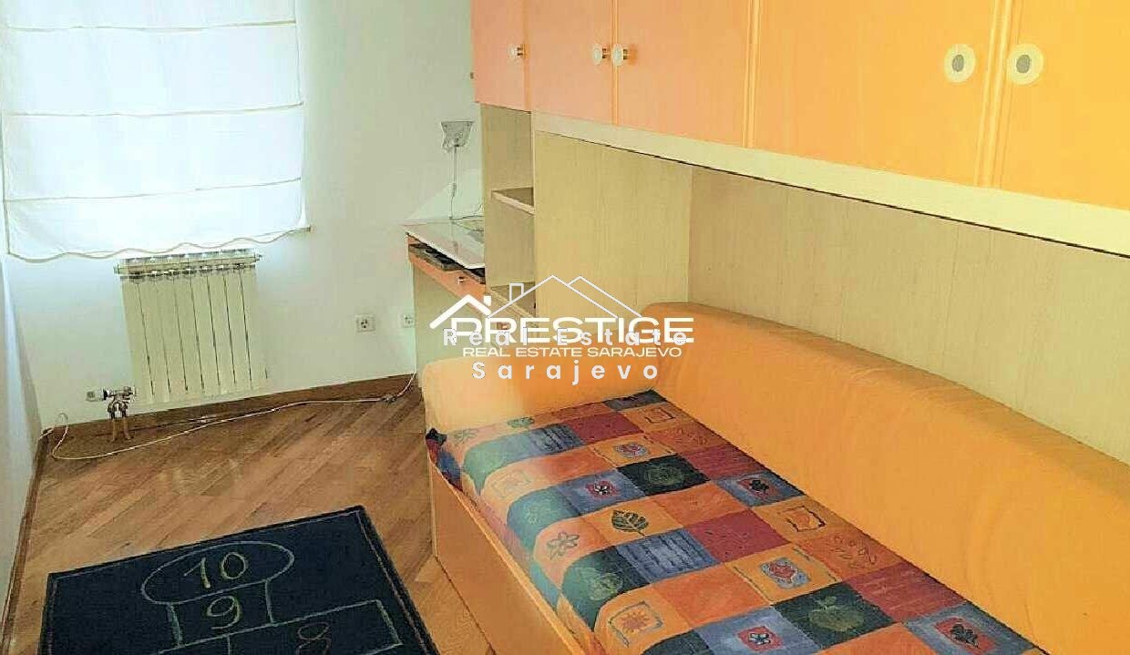 Ovaj lijep trosoban stan za iznajmljivanje nalazi se na prvom spratu stambene zgrade na Bjelavama, blizu BBI šoping centra. Stan ima 65 m2 površine i sastoji se od dnevnog boravka sa trpezarijom i u potpunosti opremljenom kuhinjom, 2 spavaće sobe, kupatila sa tuš kabinom i balkona. Kompletno je namješten. Stan ima vlastito etažno grijanje na plin, klimu, sigurnosna vrata, mašinu za veš, kablovsku TV i brzi internet pristup. Troškovi režija nisu uključeni u cijenu mjesečnog najma.
