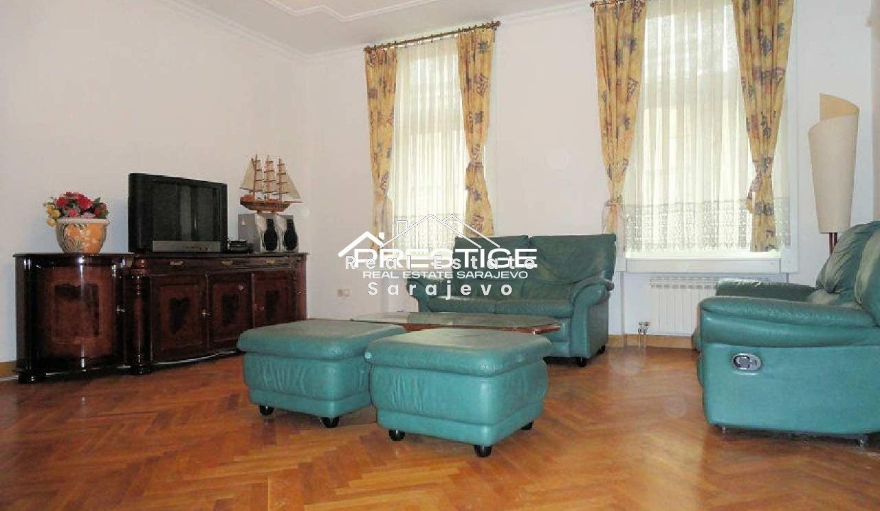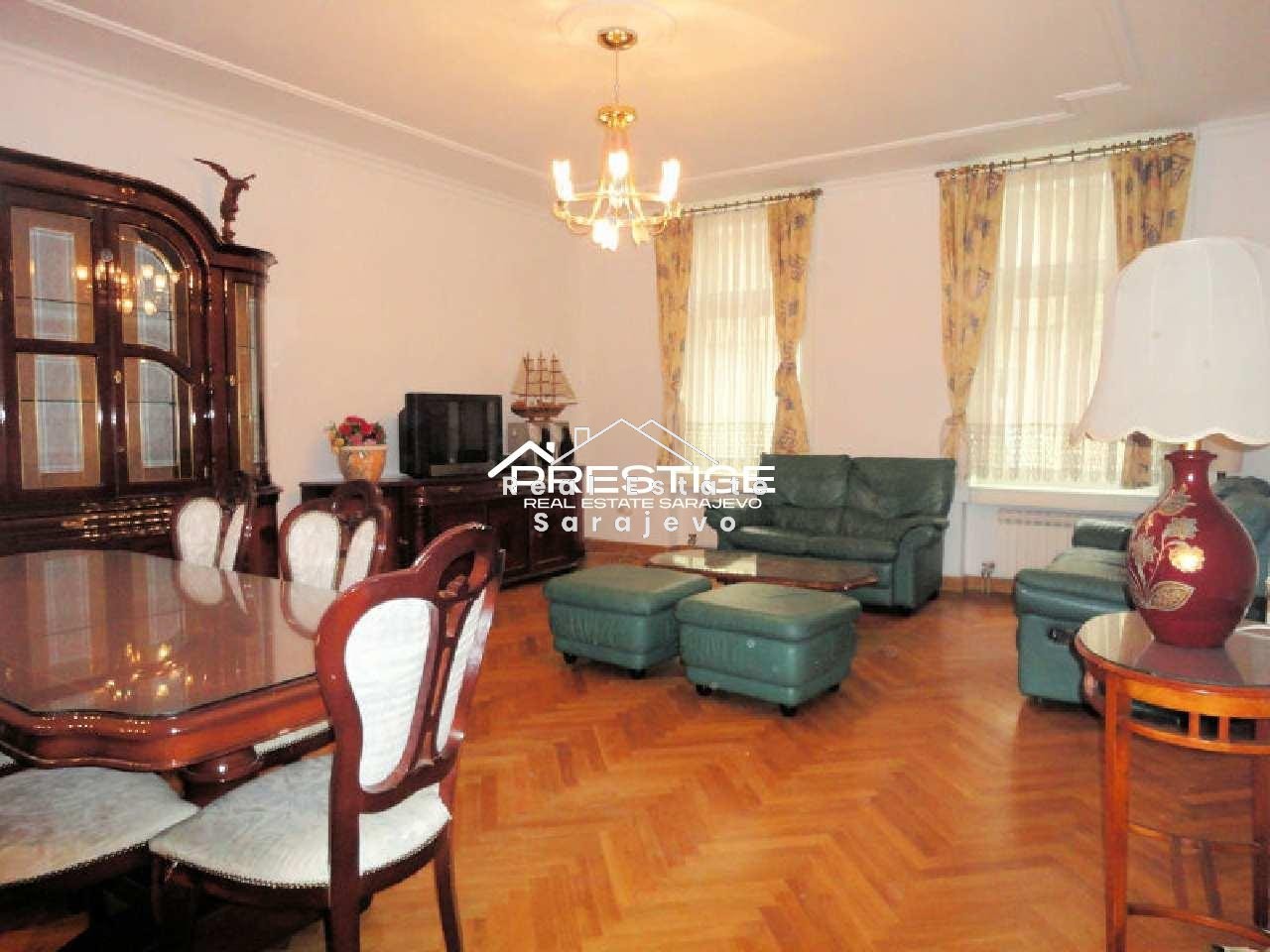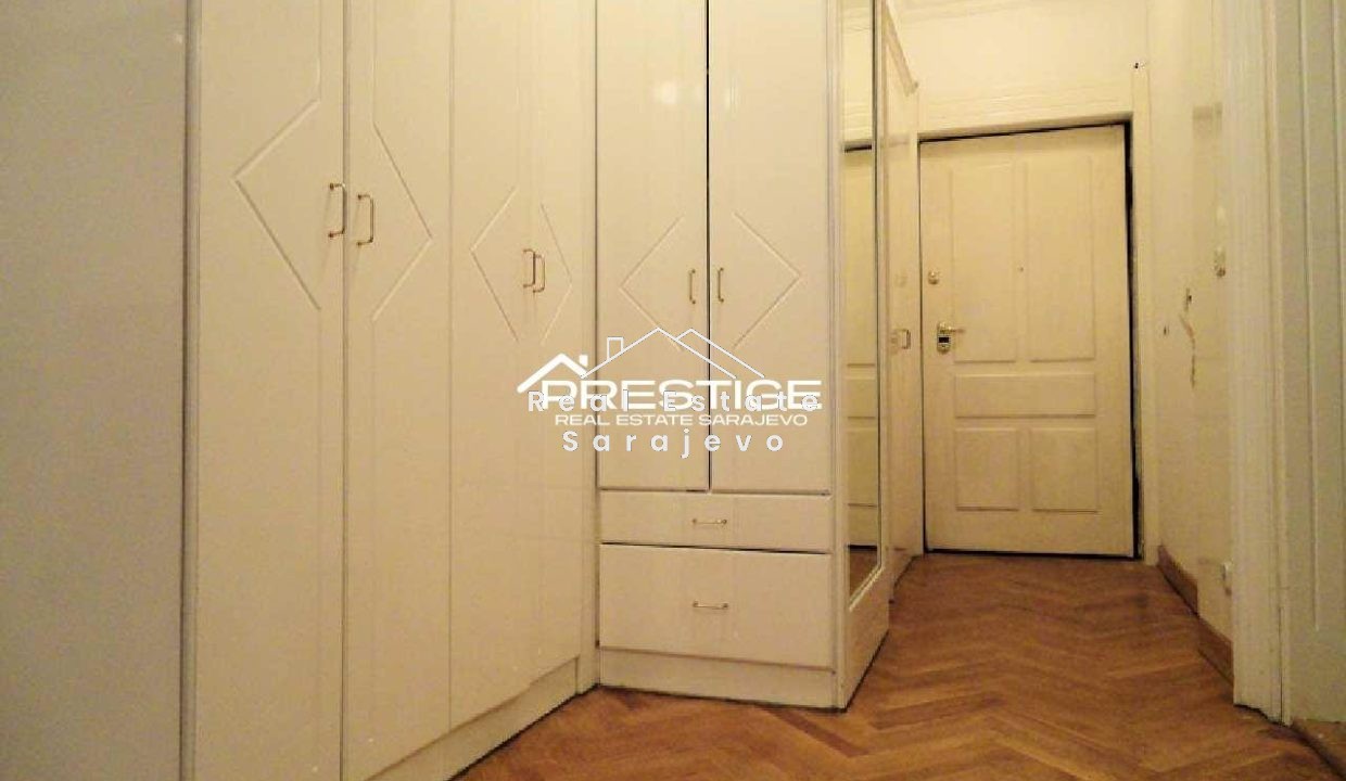 Ovaj lijep trosoban stan za iznajmljivanje nalazi se na drugom spratu stambene zgrade u strogom centru Sarajeva, nekoliko koraka od Katedrale. Stan ima 100 m2 površine i sastoji se od dnevnog boravka sa trpezarijom i u potpunosti opremljenom kuhinjom, 2 spavaće sobe, kupatila sa tuš kabinom i hodnika. Kompletno je namješten. Stan ima vlastito etažno grijanje na plin i struju (alternativa), klimu, sigurnosna vrata, mašinu za veš, mašinu za suđe, kablovsku TV i brzi internet pristup. Troškovi režija nisu uključeni u cijenu mjesečnog najma.