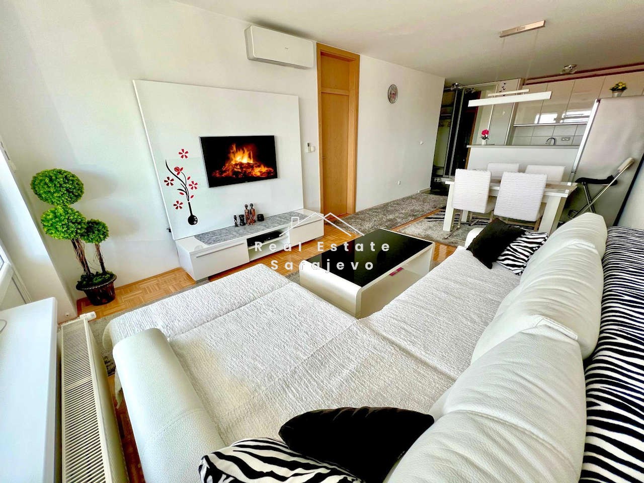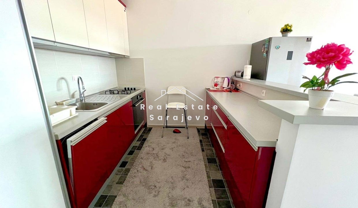 Ovaj moderan stan za iznajmljivanje nalazi se na petom spratu (dva lifta) nove stambene zgrade na Dobrinji, blizu aerodroma Sarajevo. Stan ima 54 m2 površine i sastoji se od otvorenog dnevnog boravka sa trpezarijom i u potpunosti opremljenom kuhinjom, spavaće sobe, kupatila sa kadom, hodnika i balkona sa prelijepim pogledom. Kompletno je namješten sa novim i modernim namještajem. Stan ima vlastito etažno grijanje na plin, inverter klima uređaj (opcija grijanja i hlađenja), sigurnosna vrata, mašinu za veš, mašinu za suđe, kablovsku TV i brzi internet pristup. Troškovi režija nisu uključeni u cijenu mjesečnog najma. Postoji mogućnost iznajmljivanja garaže u blizini sa video nadzorom i obezbjeđenjem za dodatnih 80KM mjesečno.