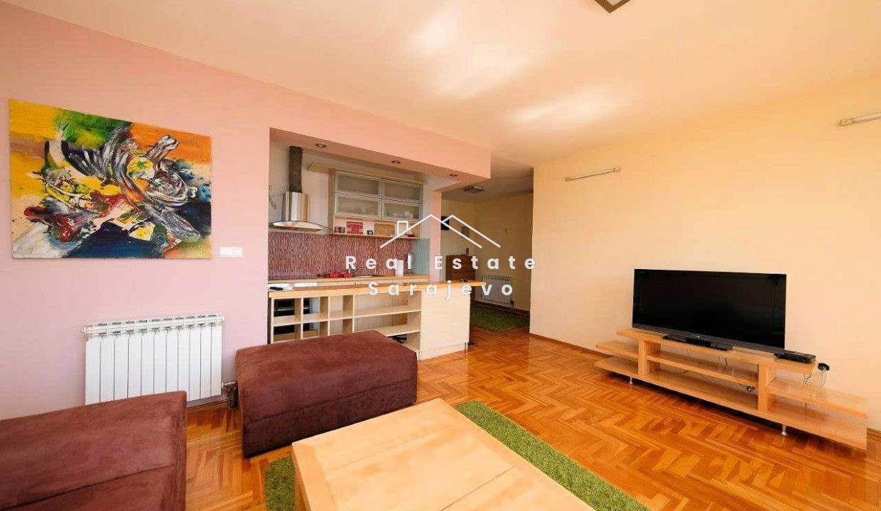 Ovaj lijep trosoban stan za iznajmljivanje nalazi se na trećem spratu male stambene zgrade (nema lifta) na Marijin Dvoru, samo par koraka od Američke ambasade i zgrade UNITIC-a. Stan ima 70 m2 površine i sastoji se od dnevnog boravka sa trpezarijom i u potpunosti opremljenom kuhinjom, 2 spavaće sobe, kupatila sa tuš kabinom, hodnika i balkona sa lijepim pogledom. Kompletno je namješten. Stan ima vlastito etažno grijanje na plin, mašinu za veš, mašinu za suđe, kablovsku TV i brzi internet pristup. Troškovi režija nisu uključeni u cijenu mjesečnog najma.