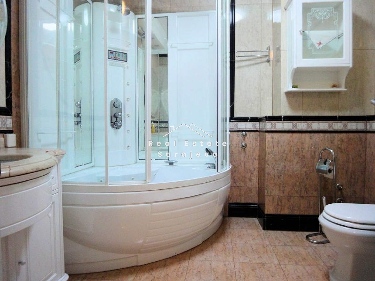 This exceptional 3 level apartment for rent is located on sixth floor (elevator) of modern residential building on Grbavica, close to SCC shopping center. Apartment has 660 m2 floor area and consists of 8 bedrooms, spacious living room with dining area, 2 fully equipped kitchens, 4 bathrooms (two with jacuzzi bath tub and two with shower cabin), separated toilet, gym, audience room ideal for receptions and 4 terraces with beautiful view. It is completely furnished. Apartment has central heating and cooling system, fireplace, washer, dryer, dishwasher, cable TV, high speed internet access, video surveillance of the building, garage and parking space. Utility bills are not included in the monthly price.
