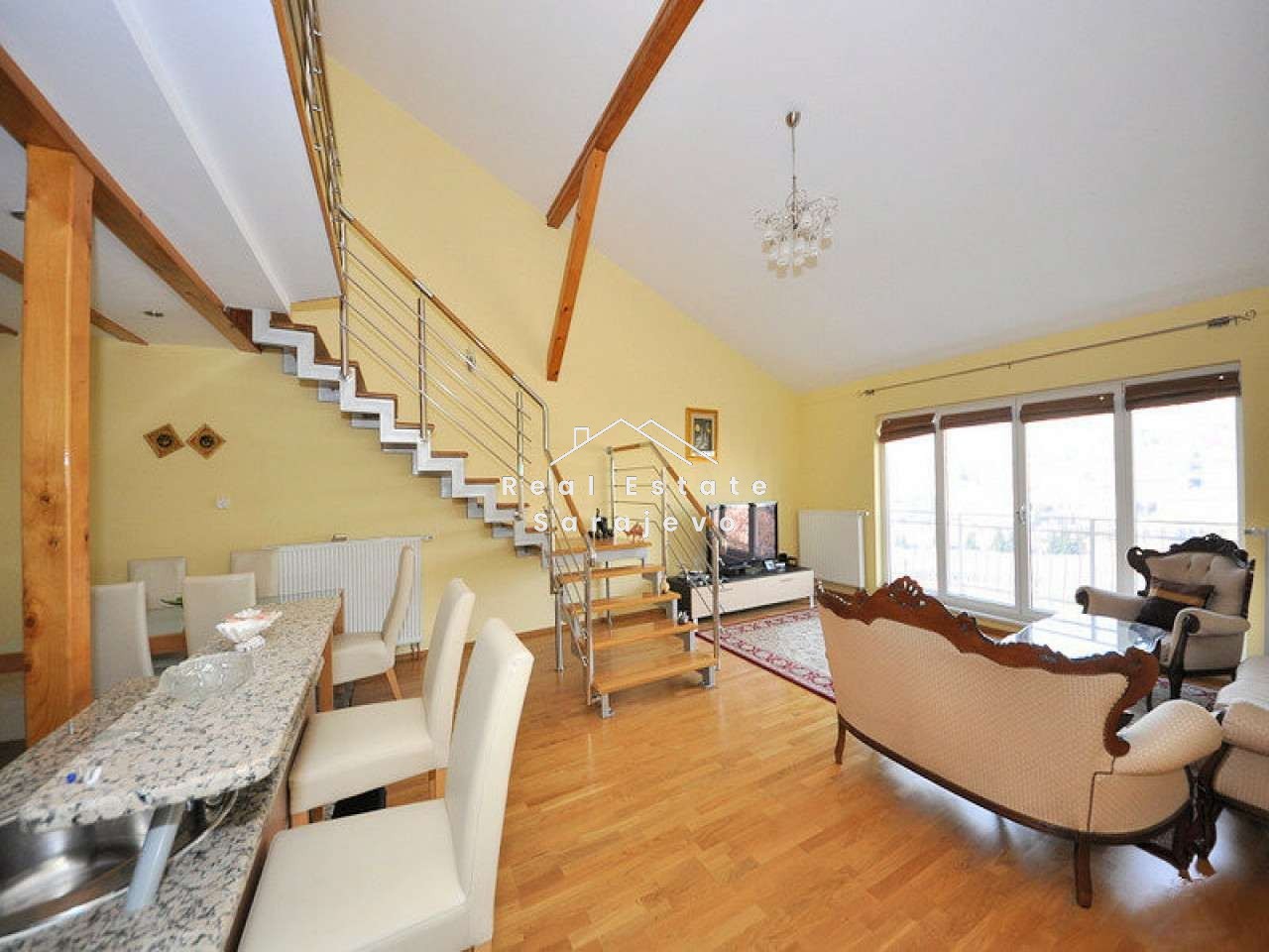 This beautiful 2 level apartment for rent is located in private house (separated entrance), on Koševsko Brdo, 10-15 minutes walking distance to SCC shopping center. Apartment has 120 m2 floor area and consists of 3 bedrooms, living room with dining area and fully equipped kitchen, bathroom with shower cabin, separated toilet and big terrace with beautiful view. It is completely furnished. Apartment has own heating system on gas, security door, washer, dishwasher, cable TV and high speed internet access. There is possibility of renting garage. Utility bills are not included in the monthly price.