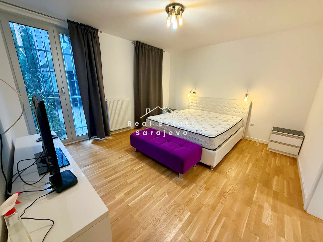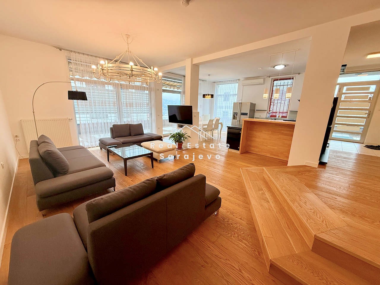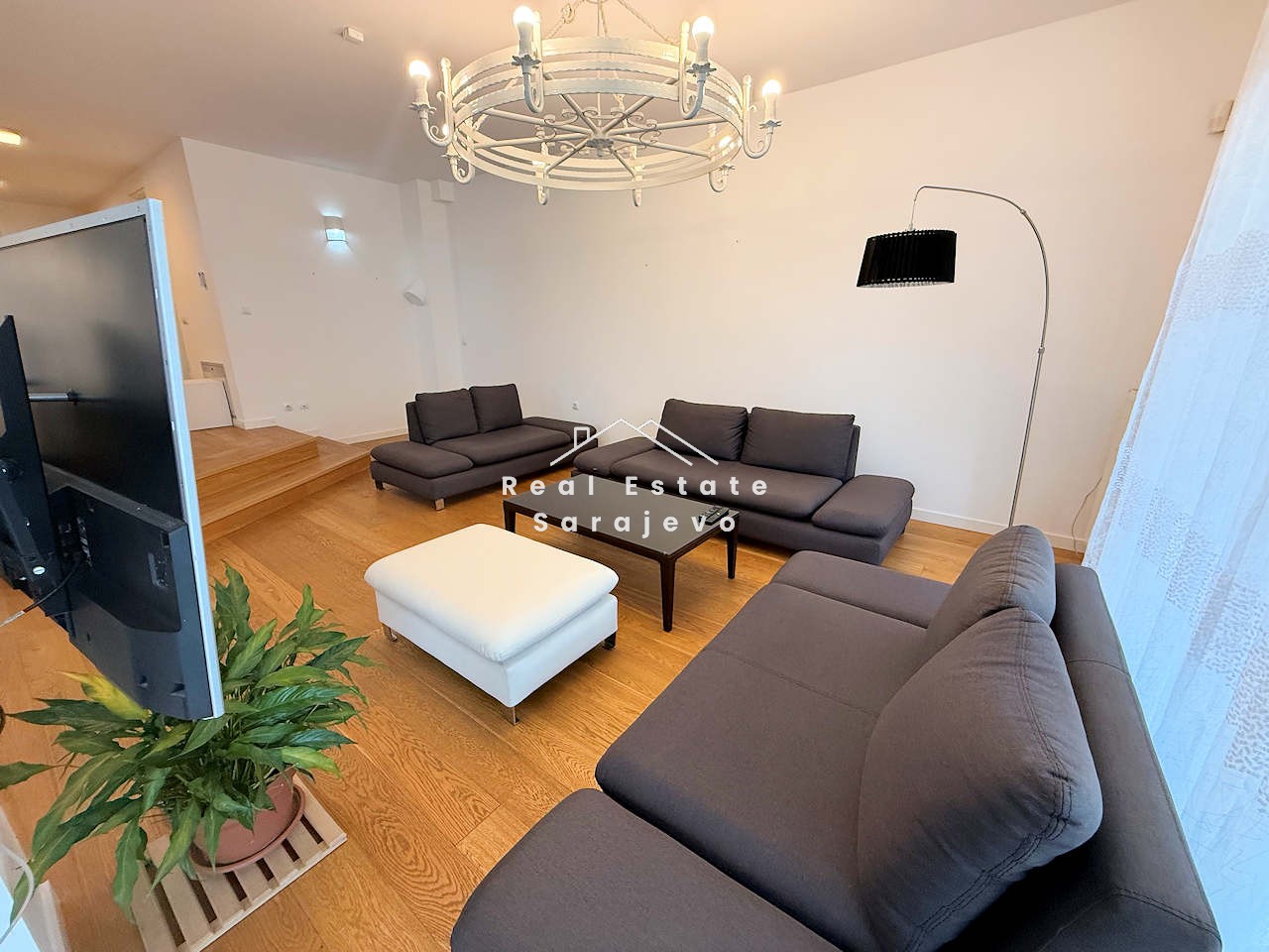This absolutely amazing apartment for rent is located on first floor of small residential building in city center, close to Olympic Stadium. Apartment has 152 m2 floor area and consists of living room, 3 bedrooms, fully equipped kitchen with dining area, 2 bathrooms (bath tub and shower cabin), hall and 100 m2 terrace with beautiful view. It is completely furnished. Apartment has own heating system on gas, air conditioner, washer, dryer, dishwasher, cable TV, high speed internet access, 100 m2 garden and 76 m2 garage suitable for 4 cars. Utility bills are not included in the monthly price.