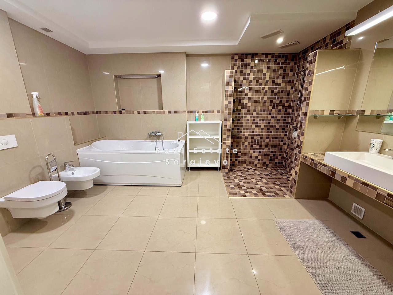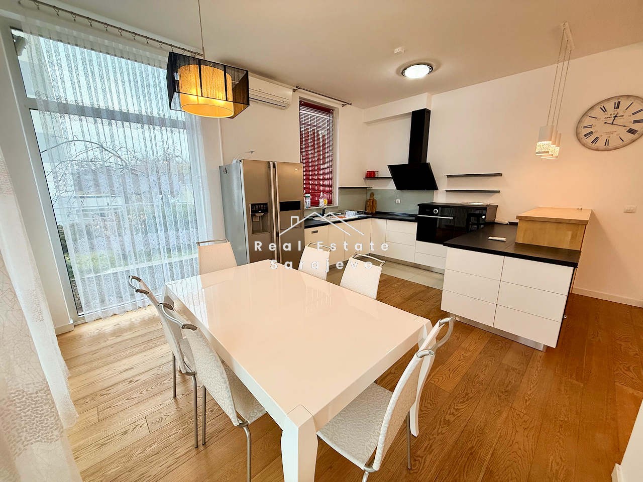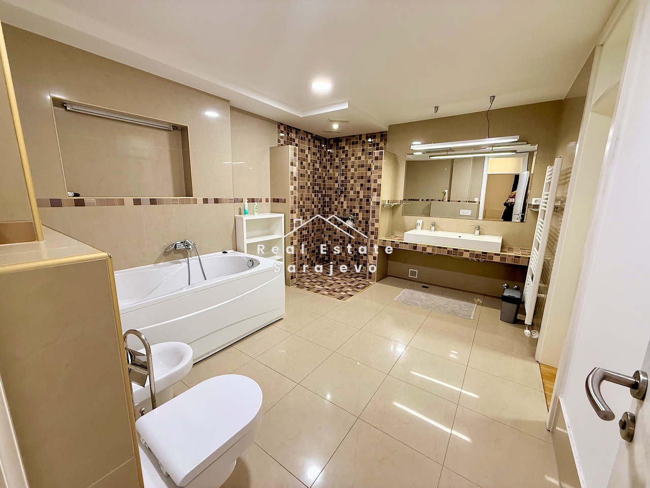 This absolutely amazing apartment for rent is located on first floor of small residential building in city center, close to Olympic Stadium. Apartment has 152 m2 floor area and consists of living room, 3 bedrooms, fully equipped kitchen with dining area, 2 bathrooms (bath tub and shower cabin), hall and 100 m2 terrace with beautiful view. It is completely furnished. Apartment has own heating system on gas, air conditioner, washer, dryer, dishwasher, cable TV, high speed internet access, 100 m2 garden and 76 m2 garage suitable for 4 cars. Utility bills are not included in the monthly price.
