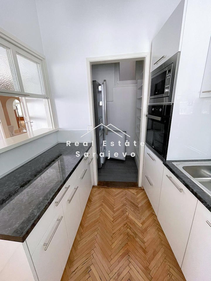 This beautiful commercial property for rent is located on second floor of residential building in the most central area of Sarajevo – Titova street, close to BBI shopping center and Eternal Flame. Property has 150 m2 floor area and consists of 4 rooms, kitchen, bathroom, toilet, storage room, spacious entrance hall and balcony. It is completely furnished. Property has own heating system on gas and electricity (alternative), air conditioners, security door, alarm, cable TV and high speed internet access. Utility bills are not included in the monthly price.